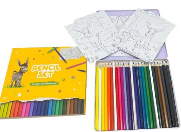 Tin of 24 assorted coloured pencils and 10 postcards to colour.