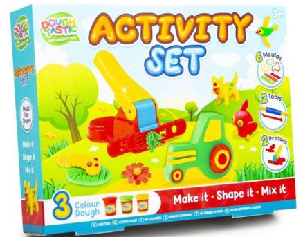 Dough activity set. 3 tubs of dough, 6 moulds, tools and 2 p...