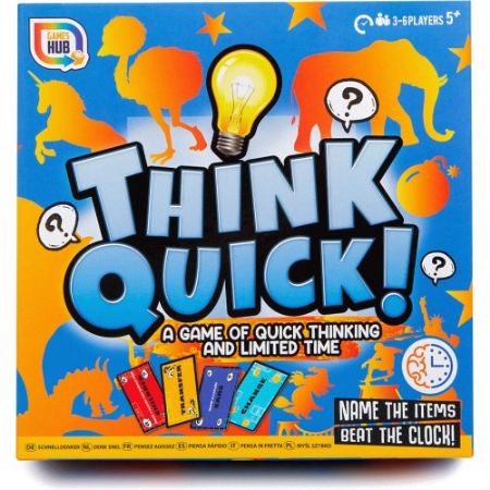 Think Quick Board Game See if you can beat the clock and name the items your card asks for. This game will test your knowledge and see if you can answer correctly under the pressure. So let the game begin by roll the dice to decide how many items you must name. The roll of the dice is what adds the adrenaline pumping twist to all the action.